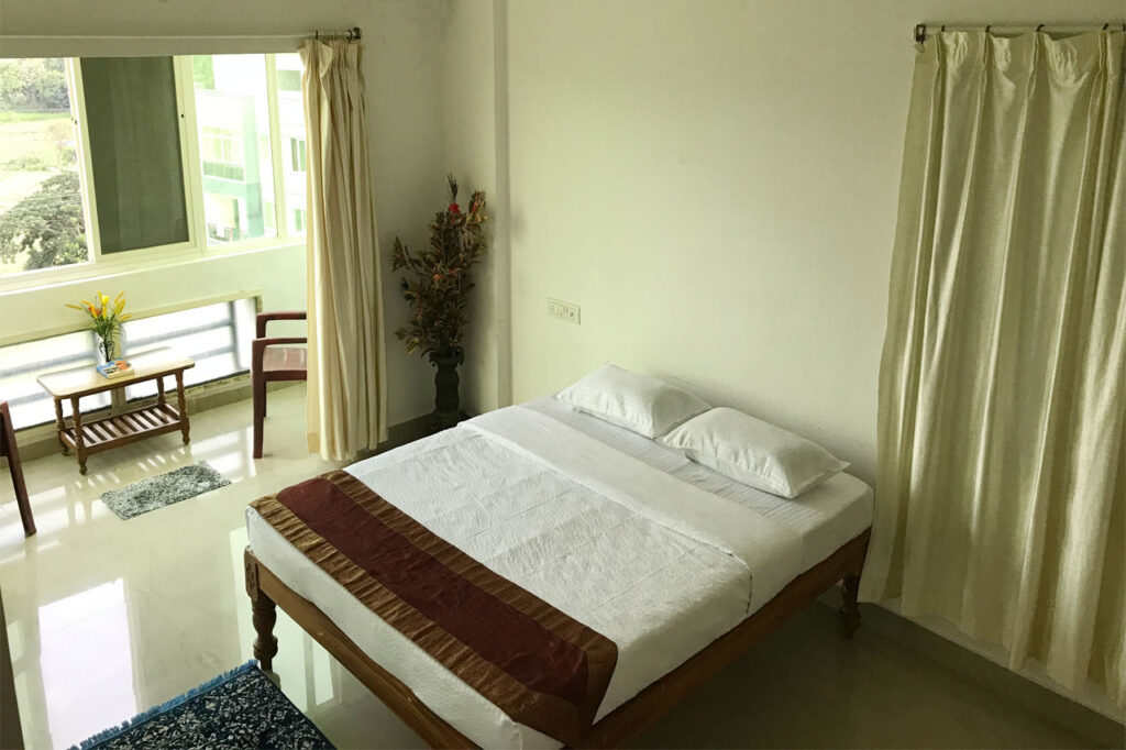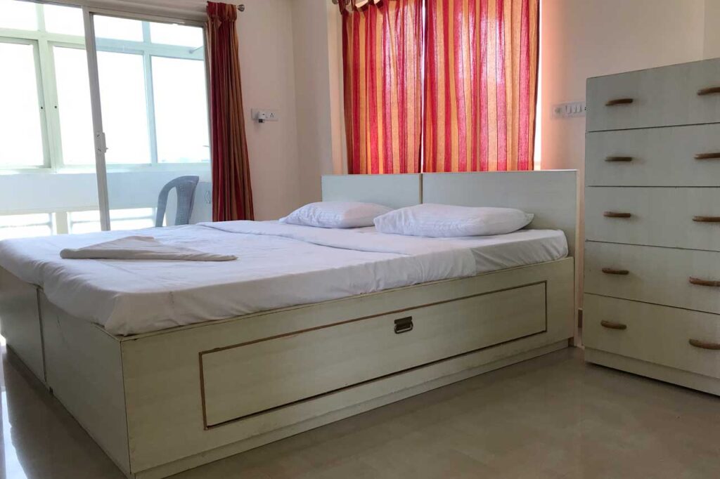 Sai Samarpan, our most lavishly furnished 1BHK suite. Designed for the discerning guest, it features a superior well-equipped kitchen, elegant interiors, and a beautiful view. It’s the perfect blend of spacious luxury and homely convenience for a truly indulgent stay.