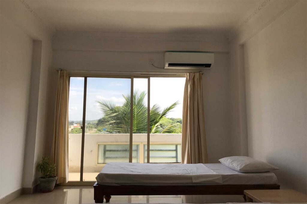 Embrace tranquility in Sai Shiva, a room dedicated to peace and introspection. Designed for the mindful traveler, it offers serene comforts, thoughtful amenities, and a calming atmosphere—perfect for those seeking a quiet retreat close to the divine energy of Puttaparthi.
